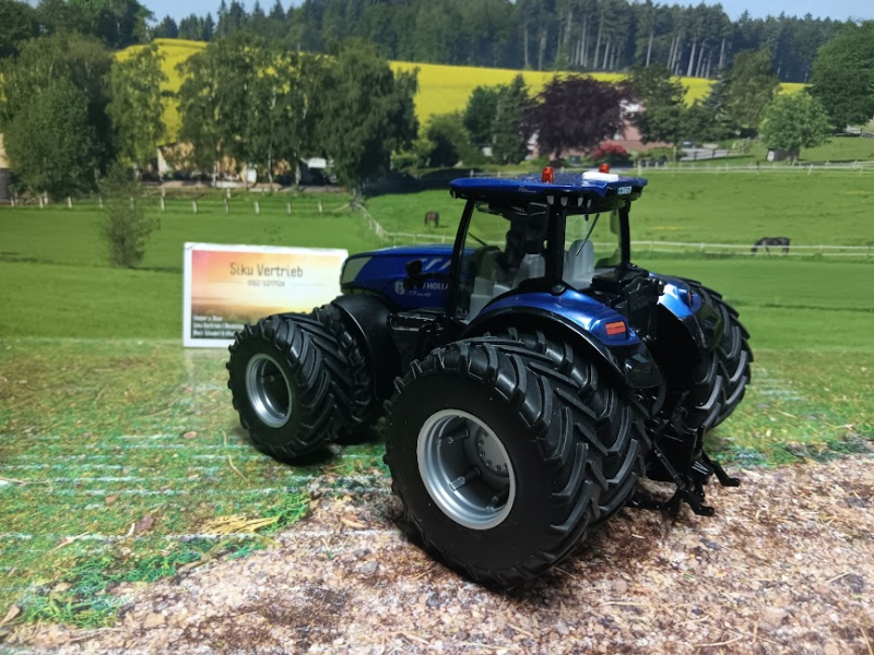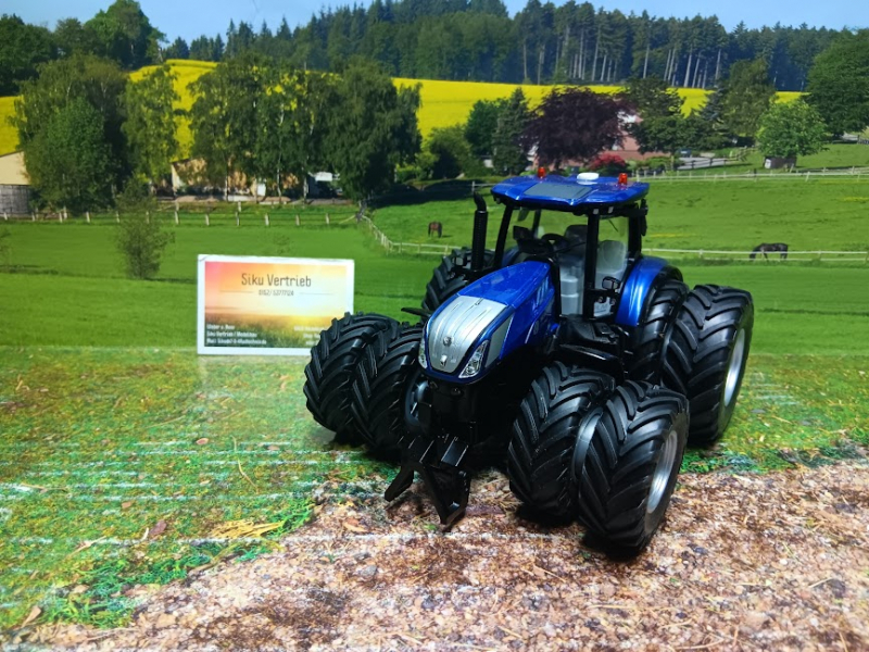 Vielseitigkeit und Stärke – dafür steht der moderne T7 Heavy Duty von New Holland. Mehr Leistung, mehr Hubkraft, mehr Flexibilität, mehr Komfort – der Premium-Traktor der 7er Baureihe wurde für moderne Landwirtschaftsbetriebe mit höchsten Ansprüchen konzipiert. Bis zu 315 PS lassen sich beim T7 für den Einsatz von schwersten Arbeitsgeräten abrufen. Das Spitzenmodell unter den Großtraktoren ist stark genug für Zugarbeiten, Bodenbearbeitung, Ballenpressen und Transporte. Mit Bluetooth-Steuerung bietet der New Holland T7 von SIKU CONTROL abwechslungsreichen Spielspaß. Seine Karosserie ist aus Metall, der Innenraum der verglasten Kabine detailgetreu gestaltet. Auch optisch macht der Großtraktor aus der SIKU CONTROL-Serie richtig Eindruck: Die Sonderfarbe Dunkelblaumetallic von New Holland und die silbernen Felgen betonen sein modernes Design. Ein Highlight sind die magnetischen Doppelreifen, die dem Modell zusätzliche Stabilität und eine besonders voluminöse Optik verleihen. Durch die integrierten Magnete können die Räder kinderleicht montiert und wieder abgenommen werden. Mit der SIKU CONTROL-App lassen sich mit Smartphone oder Tablet die drei Getriebe, die 12 LEDs und die zahlreichen Funktionen des Traktors bedienen. Fahr- und Lenkfunktionen werden proportional gesteuert – wahlweise über die virtuelle Gamepad-Steuerung oder die Bewegungssensoren der mobilen Geräte. Die SIKU CONTROL-App kann kostenlos im App Store und im Google Play Store heruntergeladen werden. Einstellungen und Funktionen der App werden laufend aktualisiert. Mit der OTA (Over-The-Air)-Funktion werden alle Updates für das Modell über den Systemstart der App automatisch geladen. Zur Energieversorgung benötigt der fernsteuerbare Traktor drei AAA-Batterien. Durch die siku-Standardkupplungen vorne und am Heck kann der New Holland-Traktor mit sämtlichen Anhängern und Zubehör aus der siku Farmer-Serie kombiniert werden.